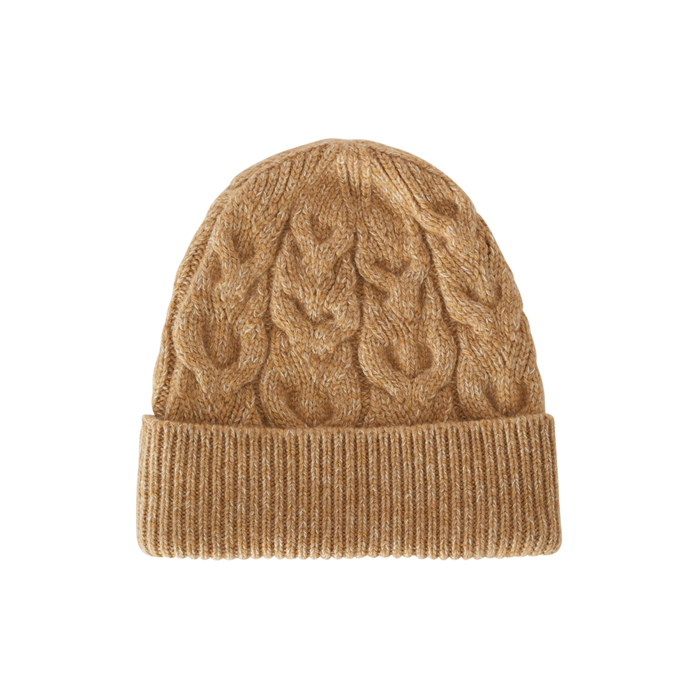 Woven from coarsehair cashmere yarn, the ‘Cappuccino’ toned beanie features a bold cable knit and compact melange ribbing.