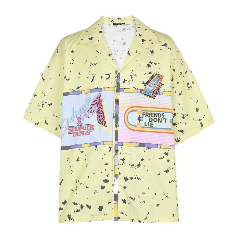 This ‘80s-inspired paint-splattered bowling shirt arrives with dual-branded graphics as well as Eleven’s “Friends Don’t Lie” slogan across the chest.